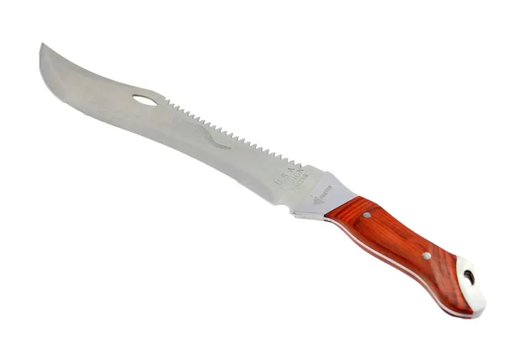 Posiada profilowaną głownię z bardzo ostrym i niezawodnym ostrzem, a na jej grzbiecie znajduje się masywna piła.