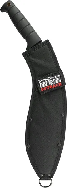 Nóż Smith & Wesson® Outback Kukri Full Tang o stałym ostrzu jest wykonany z czarnego ostrza ze stali nierdzewnej o wysokiej zawartości węgla. Jego głęboko żłobiona, owinięta gumą rękojeść jest wyposażona w otwór na smycz i czarną poliestrową pochwę na pasek/ramię.