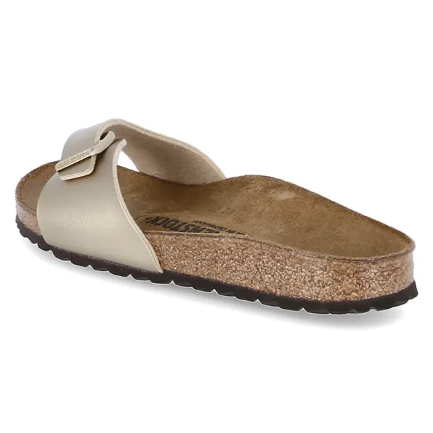 materiału Birko-Flor, która jest przyjemna dla skóry. Dla zwiększenia komfortu materiał został podszyty miękkim, oddychającym polarem. Specjalnie zaprojektowana anatomiczna wkładka została stworzona z ekologicznego materiału korkowego, który zapewnia sandałom świetną izolację oraz wspomaga amortyzację. Miękka i delikatna wyściółka z zamszowej skóry odpowiada za niezwykły komfort i znakomite dopasowanie do kształtu stopy. Damskie klapki Birkenstock Madrid zostały wyposażone w lekką piankową podeszwę zewnętrzną EVA, która neutralizuje niewielkie nierówności na drodze i dba o znakomitą amortyzację.
