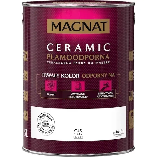 MAGNAT Ceramic to ceramiczna farba do wnętrz, 3. generacji bazująca na ceramicznych komponentach oraz najwyższej jakości żywicach i pigmentach. Ta unikalna formuła zapewnia farbie MAGNAT ponadprzeciętne parametry odporności na szorowanie i wielokrotne zmywanie oraz sprawia, że powłoki farby nie absorbują zabrudzeń i „trudnych” plam oraz są odporne na dezynfektanty. Zapewnia to uzyskanie wyjątkowej trwałości powłoki i kolorów.