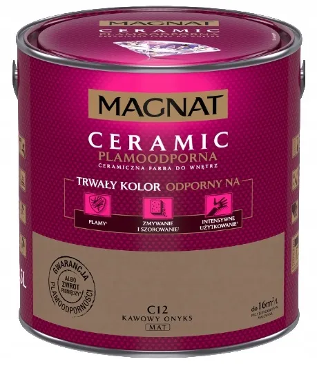 MAGNAT Ceramic to ceramiczna farba do wnętrz bazująca na ceramicznych komponentach oraz najwyższej jakości żywicach i pigmentach. Ta unikalna formuła zapewnia farbie MAGNAT ponadprzeciętne parametry odporności na szorowanie i wielokrotne zmywanie oraz sprawia, że powłoki farby nie absorbują zabrudzeń i „trudnych” plam oraz są odporne na środki dezynfekujące. Zapewnia to uzyskanie wyjątkowej trwałości powłoki i kolorów.