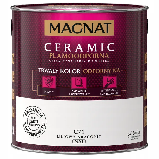 MAGNAT Ceramic to ceramiczna farba do wnętrz bazująca na ceramicznych komponentach oraz najwyższej jakości żywicach i pigmentach. Ta unikalna formuła zapewnia farbie MAGNAT ponadprzeciętne parametry odporności na szorowanie i wielokrotne zmywanie oraz sprawia, że powłoki farby nie absorbują zabrudzeń i „trudnych” plam oraz są odporne na środki dezynfekujące. Zapewnia to uzyskanie wyjątkowej trwałości powłoki i kolorów.