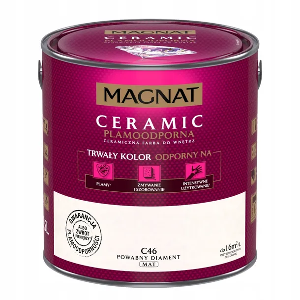 Emulsja Magnat Ceramic w kolorze powabny diament to ceramiczna farba trzeciej generacji marki Śnieżka. Unikalna formuła emulsji Magnat daje jej ponadprzeciętne parametry odporności na wielokrotne zmywanie i szorowanie na mokro. Do czyszczenia można używać dezynfektantów, gdyż emulsja ta jest odporna na środki czyszczące. Powierzchnie pokryte tą farbą są plamoodporne, nie absorbują zabrudzeń i trudnych plam np. z wina, kawy, ketchupu, oleju, pisaków wodnych, kredek itp. Po nałożeniu na podłoże, farba zapewnia mu trwałe kolory i powłokę. Szczególnie polecana jest ona do dekoracyjno - ochronnego malowania ścian oraz sufitów wewnątrz pomieszczeń. Możną malować nią tynki cementowe, cementowo-wapienne, gipsowe, gipsowo-kartonowe, a także tapety z włókna szklanego. Przystosowana jest ona również do nakładania na powierzchnie drewniane, drewnopochodne i metalowe użytkowane wewnątrz pomieszczeń. Podczas malowania emulsja nie chlapie, malowanie nią jest łatwe i przyjemne, nie sprawia problemów nawet amatorom. Farba jest bardzo wydajna, 1 l wystarcza na pomalowanie 16 m2 powierzchni.