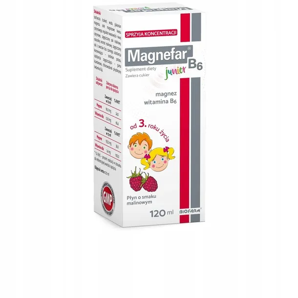 Magnefar B6 Junior to wysokiej jakości suplement diety o smaku malinowym, który dostarcza cennych składników odżywczych niezbędnych dla prawidłowego rozwoju najmłodszych. Zawiera magnez i witaminę B6, wspierając funkcjonowanie układu nerwowego, zmniejszając uczucie zmęczenia i znużenia oraz przyczyniając się do utrzymania prawidłowych funkcji psychologicznych.