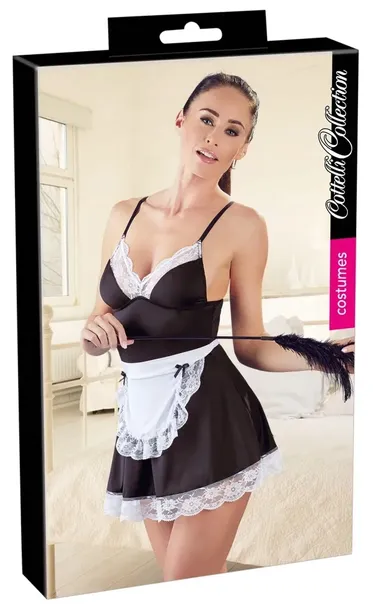 Zapewnij sobie niezapomniane chwile pełne fantazji i rozkoszy dzięki tej klasycznej i gorącej sukience pokojówki. Doskonale dopasowany fason z regulowanymi ramiączkami i lekko rozkloszowaną częścią spódnicy podkreśli Twoje kobiece kształty. Biały koronkowy materiał ozdabia dolną część sukienki oraz dekolt, dodając jej uroku i subtelności.