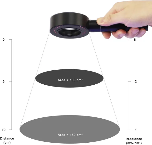 Nasza ręczna lampą Wooda to autonomiczne źródło światła z centralną linią UV o długości fali 365 nm. Diody LED UV są zamontowane w okręgu wokół centralnej szklanej soczewki, co pozwala chronić oczy personelu pracującego z urządzeniem