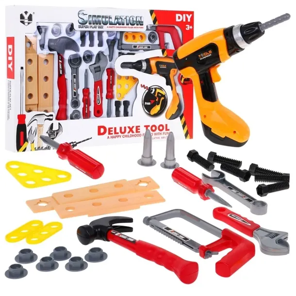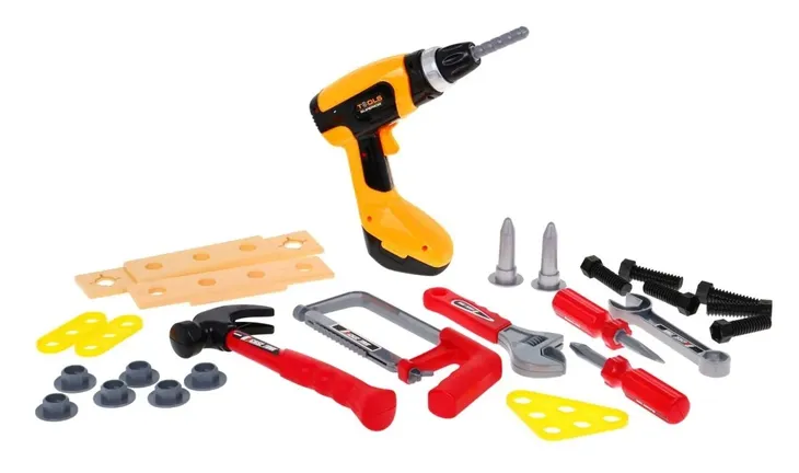 Zestaw narzędzi dla dzieci od 3-go roku życia. Zestaw zawiera 26 elementów, wszystko co niezbędne małemu majsterkowiczowi: kołki, śrubki, śrubokręt, klucze, młotek, piłę do metalu a przede wszystkim wiertarko-wkrętarkę która zasilana jest bateriami typu 2 x AA (brak w zestawie). Podczas wkręcania lub wykręcania narzędzie wydaje charakterystyczne odgłosy pracy.
