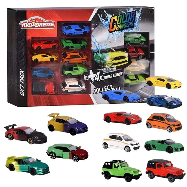 Ten zestaw upominkowy Majorette obejmuje pojazdy z dwóch ekscytujących kolekcji: dziewięć modeli z kolekcji standardowej i cztery ekskluzywne samochodziki z aktualnej edycji limitowanej Color Changers. Charakterystyczną cechą tej edycji jest specjalny dwuwarstwowy lakier – zmieniający kolor, gdy temperatura rośnie lub spada, na przykład gdy pojazdy są umieszczone w lodówce lub bezpośrednio przy skórze np. w ręce. Kolor zmienia się szybko w zimnej wodzie i powraca do pierwotnego koloru po umieszczeniu pojazdów w ciepłej wodzie. W zestawie znajdują się również dwa ekskluzywne modele – Lamborghini Urus i Nissan GT-R w specjalnych kolorach. Dzięki imponującej gamie modeli zestaw jest idealnym prezentem dla kolekcjonerów w wieku od 3 lat. Jak zwykle, wszystkie modele Majorette są wykonane z wysokiej jakości metalowej obudowy odlewanej ciśnieniowo i mają ruchome elementy.