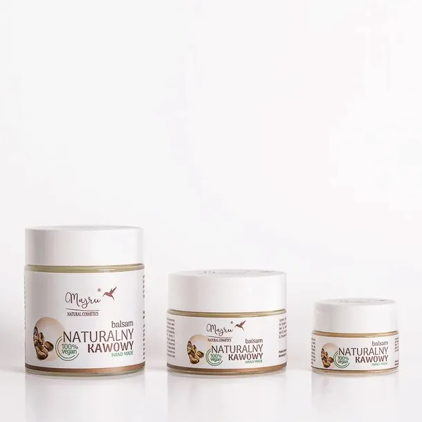 Balsam kawowy to bardzo wydajny i wszechstronny produkt do pielęgnacji skóry o cudownym, kawowym zapachu. Zawiera w składzie wosk sojowy, olej z prażonych ziaren kawy, olej makadamia, olej ze słodkich migdałów i witaminę E. Składniki dobrane zostały pod kątem poprawy gładkości, jędrności, napięcia i elastyczności skóry. Balsam ma konsystencję stałą, dzięki czemu jest bardzo wydajny: niewielka ilość wystarcza na pokrycie dużej powierzchni skóry. Nadaje się do stosowania na twarz i ciało. Świetnie sprawdzi się w pielęgnacji ust, skóry pod oczami, dłoni, ud, pośladków, stóp. Zapach balsamu działa na zmysły pobudzająco… To kawowe espresso dla skóry!