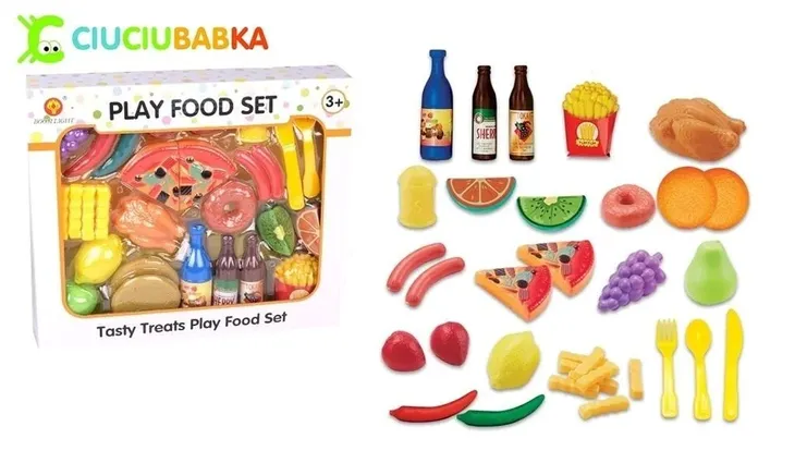 zestaw 30 elementów zawierających sztućce, buteleczki, owoce, placki