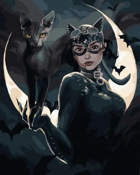 Tajemnicza kobieta w masce kotki w towarzystwie czarnego kota i nietoperzy. Obraz z charakterem i siłą dla tych, którzy lubią ciemny klimat i odrobinę rebelii.