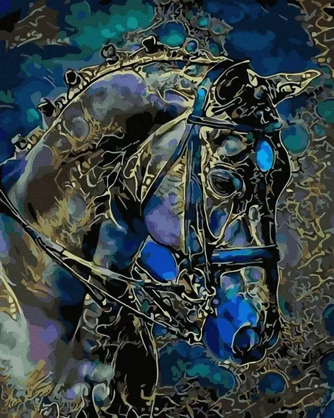 Elegancka i pełna detali głowa konia w złoto-niebieskiej stylistyce. Obraz idealny dla miłośników koni i majestatycznych stworzeń.