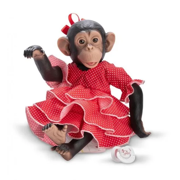 Animal Reborn - Małpka Lola w hiszpańskiej sukience Asi 0607250 32 cm Niepowtarzalna, pachnąca wanilią winylowa małpka o wysokości 32 cm to ekskluzywny projekt z kolekcji Animal Reborn, skierowany do kolekcjonerów oraz dzieci w wieku powyżej 3 lat. Ubrana w oryginalny, szyty ręcznie outfit Lola 0607250 z pewnością uczyni każdą kolekcję zabawek wyjątkową. Szympans jest też ciekawą alternatywą dla lalek. Pokochają go dzieci, które są miłośnikami zwierząt. Hiszpańska małpka Lola 0607250 Zwracająca uwagę realistycznym wyglądem, dopracowana w najdrobniejszych szczegółach małpka renomowanej hiszpańskiej marki Asi wykonana została z miękkiego, gładkiego winylu. Zwracają uwagę brązowe oczy o głębokim spojrzeniu. Kończyny można ułożyć dowolnie. Głowa jest również ruchoma, dzięki czemu zabawka może przyjmować różne pozy. Odkryj detale stroju małpki hiszpańskiej Lola 0607250 marki Asi! Małpka Lola 0607250 prezentuje się niezwykle modnie, ponieważ ubrana w efektowną, uszytą ręcznie kreację w stylu hiszpańskim: falbaniasta, bawełniana czerwona sukienka posiada krótkie rękawki i zapięcie na rzep, lśniąca satynowa kokardka, dekorująca główkę, dodaje strojowi elegancji. Szympans posiada także pieluszkę oraz przypinany smoczek na łańcuszku. Zachęca do wcielania się w rolę troskliwego opiekuna i sprawdza się jako codzienny towarzysz przygód. Doskonały na jedyny w swoim rodzaju prezent. Zapakowany jest w oryginalne, eleganckie różowo-białe pudełko z wieczkiem.