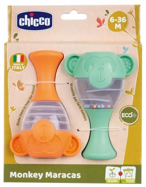 MAŁPKI MARAKASY ECO+ od Chicco - pierwsze muzyczne grzechotki maluchaGrupa wiekowa: 6-36MMałpki Marakasy ECO+ to idealne pierwsze muzyczne grzechotki dla Twojego maluszka. Stworzone z myślą o najmłodszych, kolorowe marakasy zachęcą każde dziecko do zabawy dźwiękami i muzyką, jednocześnie wspierając rozwój psychomotoryczny i sensoryczny. Cechy i zalety- Lekkie i Łatwe do Chwycenia: Marakasy są lekkie i mają idealny rozmiar dla małych dziecięcych rąk, co ułatwia chwytanie i potrząsanie.- Agażująca zabawa: Potrząśnij marakasami i odwróć je do góry nogami, aby zobaczyć, jak kuleczki sturlają się po różnych trasach wewnątrz, stymulując zmysły dziecka.- Rozwój koordynacji manualnej i umiejętności słuchowych: Delikatne dźwięki grzechotki pomagają rozwijać słuchowe zmysły dziecka, a manipulowanie zabawką wspiera koordynację ruchową.- Plastik z recyklingu: Marakasy wykonane są w 60% z plastiku z recyklingu pochodzącego z odpadów przemysłowych, co przyczynia się do ochrony środowiska.- Opakowanie z papieru certyfikowanego przez FSC(R): Pudełko nadaje się do recyklingu i zostało wykonane z papieru certyfikowanego przez FSC(R), wspierając ochronę lasów. Korzyści dla rozwoju dziecka- Dźwiękowa sensoryka: Delikatne potrząsanie grzechotką wyzwala różnorodne dźwięki, co pomaga rozwijać słuchowe zmysły dziecka.- Rytmiczne umiejętności: Marakasy są doskonałym narzędziem do nauki prostych rytmów i kształtowania umiejętności muzycznych.- Rozwój ruchowy: Potrząsanie marakasami wymaga prostej, ale kontrolowanej koordynacji ruchowej, co przyczynia się do rozwijania zdolności manipulacyjnych małych rąk.- Stymulacja wzrokowa: Różnorodne kolory i kształty marakasów przyciągają wzrok dziecka, sprzyjając rozwijaniu umiejętności obserwacji i koncentracji.- Edukacja muzyczna: Wprowadzenie do podstaw muzyki poprzez eksplorację dźwięków, rytmów i melodii, co jest świetnym początkiem dla przyszłych małych muzyków.- Interakcja społeczna: Zabawa marakasami może być również doskonałą okazją do interakcji z innymi dziećmi lub rodzicami, wspierając rozwój umiejętności społecznych i komunikacyjnych. Specyfikacja produktuGrupa wiekowa: 6-36 miesięcyWymiary zabawki: 9,5 x 15 x 7 cmWymiary opakowania: 19 x 25 x 8 cm Bezpieczeństwo i trwałośćMarakasy są wykonane z bezpiecznych dla dziecka materiałów i pozbawione ostrych krawędzi, co zapewnia bezpieczeństwo podczas zabawy. Solidna konstrukcja gwarantuje trwałość i długotrwałą radość z użytkowania. Małpki Marakasy ECO+ to nie tylko zabawka, ale również narzędzie edukacyjne, które wspomaga rozwój kluczowych umiejętności u najmł ęki Małpkom Marakasom ECO+ podarujesz maluszkowi godziny muzycznej i wesołej zabawy.