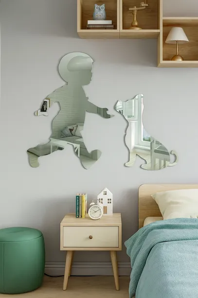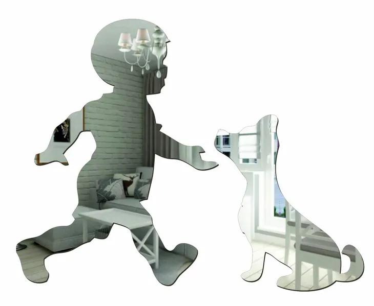 Lustro dekoracyjne akrylowe w kształcie chłopca z psem — stylowa i bezpieczna dekoracja ścienna do pokoju dziecięcego. Produkt 100% polski, wykonany z lustrzanego akrylu o grubości 3 mm, w zestawie z taśmą dwustronną do szybkiego montażu. Wymiary standardowe: 700 × 549 mm. Możliwość wykonania lustra w dowolnym rozmiarze.