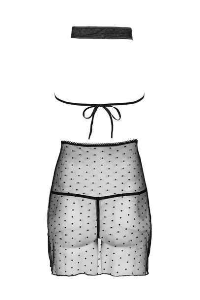 Dwuczęściowy zestaw bielizny Manirtamod producenta LivCo Corsetti Fashion. Składa się z prześwitującej koszulki z wycięciami na bokach oraz majtek typu stringi. Całość prezentuje się bardzo sensualnie. Każda kobieta w zestawie bielizny nocnej Manirtam będzie prezentować się wyjątkowo. Krótka koszulka kończy się w górnej części ud. Poprzez swoje koronkowe wykończenie i prześwitujący materiał jest jednocześnie sekowana i elegancka. Topropozycja dla odważnych kobiet, które chcą się wyróżnić. Skład materiału sprawia, że tkanina jest lekko elastyczna i dopasowuje się do kształtów ciała. Komplet jest dostępny w dwóch rozmiarach s/m oraz l/xl. Swobodna forma koszulki, sprawia, że mogą ją nosić kobiety o różnym typie sylwetki. Głeboki czarny kolor zestawu oraz materiał w drobne kropeczki powodują, że dwuczęściowy komplet bielizny Manirtam prezentuje się jednocześnie wytwornie i dziewczęco. To dobra propozycja zarówno na randkę, jak i spokojny wieczór, gdy chcemy podkreślić, zakładając piękną bieliznę.