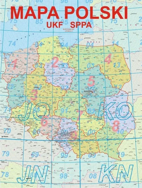 Mapa Polski o wymiarach 68 x 48cm z lokatorami UKF i podziałem na okręgi wywoławcze SP.