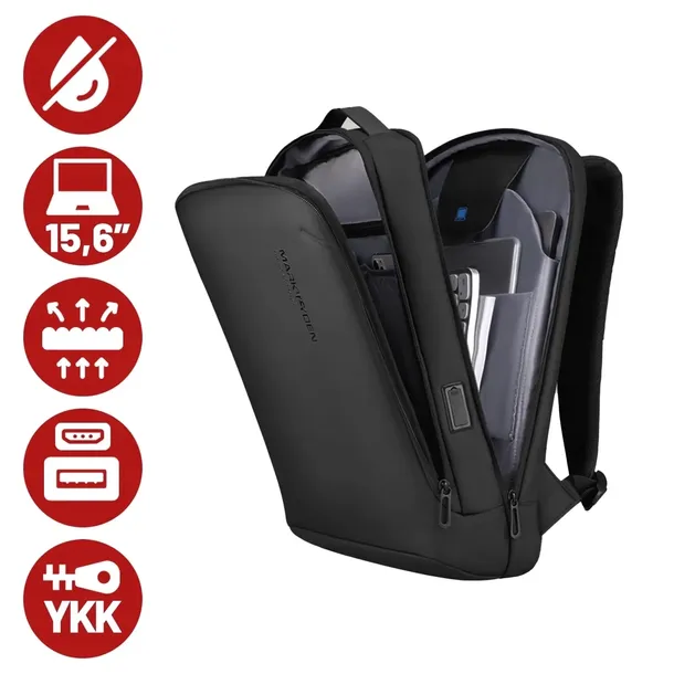 ▶️ Plecak na Laptopa 15.6" Mark Ryden, Wodoodporny, Lekki i Smukły, Podróżny z Wyjściem USB, Kieszenią na Karty i Zamkiem YKK, Materiał EVA, 14L (42×30×12 cm) – Czarny