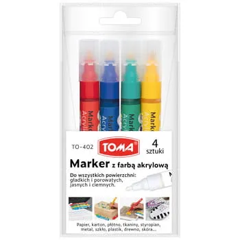 Marker Akrylowy do zdobienia i malowania po papierze, kartonie, płótnie, styropianie, drewnie i wielu innych powierzchniach. Farba akrylowa na bazie wody, nietoksyczna, nie zawiera ksylenu. Przed użyciem dobrze wstrząsnąć i naciskać końcówkę, aż do do wypłynięcia farby. Kolory: niebieski, zielony, czerwony, żółty.
