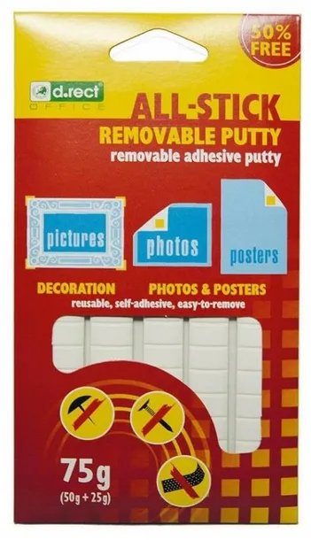 All-Stick to uniwersalna, samoprzylepna masa mocująca. Czysta i łatwa w użyciu. Zastępuje pinezki i taśmę samoprzylepną. Do wielokrotnego mocowania plakatów, pocztówek, wiadomości np. do ścian, drzwi, tablic oraz okien.- łatwa do usunięcia, nie pozostawia śladów- do wielokrotnego użycia- opakowanie 75g