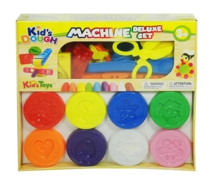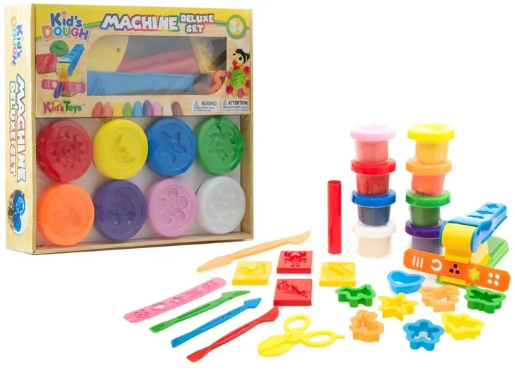 Zestaw masy plastycznej. W skład zestawu wchodzi 8 kubeczków z masą (8 różnych kolorów). Poza tym w zestawie znajdują się także foremki, wyciskarka, nożyczki, nożyki. Zestaw pozwoli ćwiczyć dzieciom ich małe zwinne paluszki, a także będzie rozwijał u dzieci wyobraźnię i kreatywność. Po zakończonej zabawie, ciastolinę należy chować do kubeczków, aby uniknąć jej wyschnięcia (a dalej kruszenia). Zabawka przeznaczona dla dzieci powyżej 3 lat.