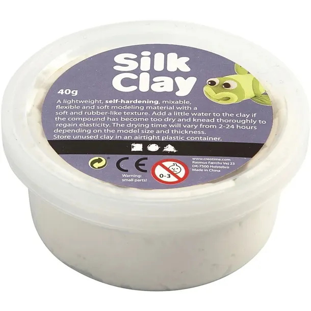 Masa Silk Clay Biała 40 gSilk Clay to samotwardniejąca masa modelarska na bazie wody. Można stosować na różnych powierzchniach (drewno, papier, nieszkliwiona ceramika, materiał itp.). Można łączyć kolory lub malować akrylowymi farbami po wyschnięciu. Przed użyciem należy wymieszać! Przechowywać w zamkniętym plastikowym pojemniku. Wymiary opakowania: wysokość 4 cm, średnica wieczka 8,5 cm. Zawiera 40 g masy.
