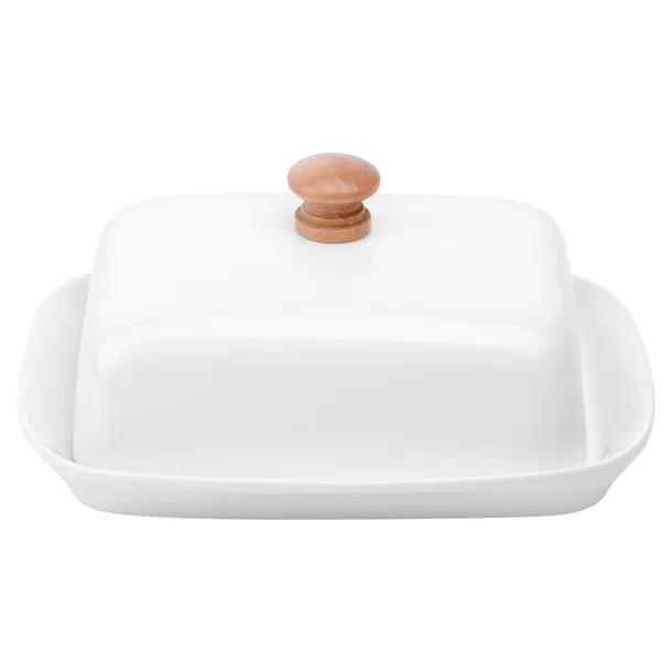 Maselniczka wykonana z ceramiki w białym kolorze z drewnianym uchwytem. Idealna do przechowywania i serwowania masła.