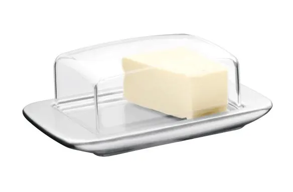 Zmieści się w niej cała kostka, a wyższe brzegi podstawki zapobiegają ześlizgiwaniu się masła i zwiększają stabilność szczelnej pokrywki. Maselniczka nadaje się do zmywarki.