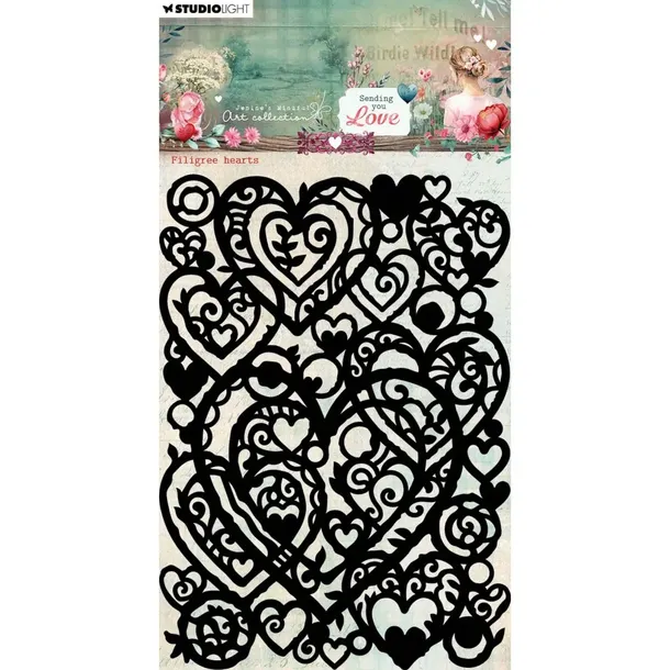Maska Filigree Hearts od Studio Light to wyjątkowy szablon z kolekcji "Jenine's Mindful Art - Sending You Love". Wzór przedstawia misterne, filigranowe serca wkomponowane w delikatny, ażurowy ornament. Maska ma standardowe wymiary 105 x 148 mm, co odpowiada formatowi A6.