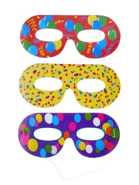 Zestaw kolorowych paperowych masek na elastycznej gumce. Długość maski 16 cm.