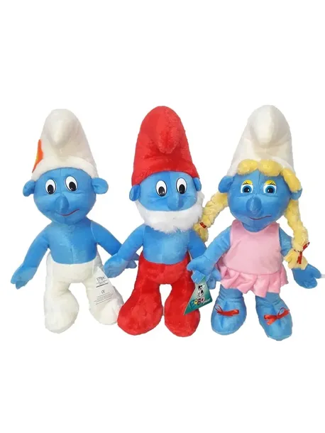 Miękka pluszowa zabawka do przytulania, o wyglądzie smerfów.