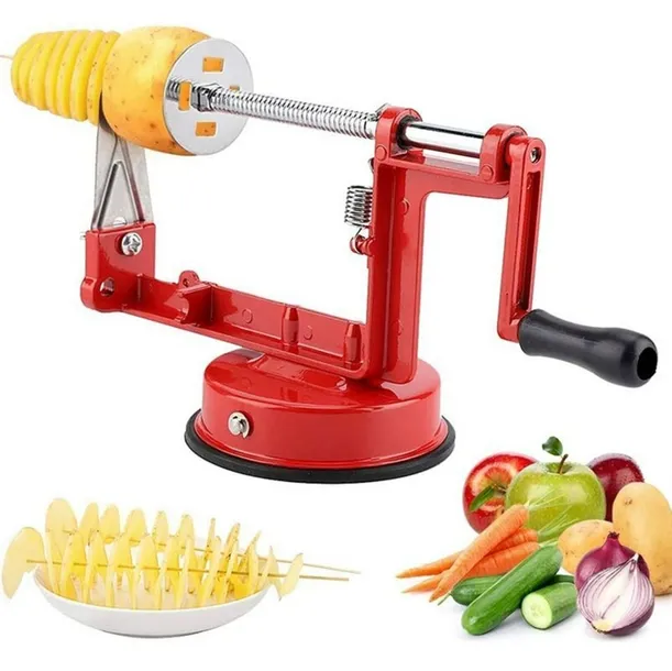 Maszynka ręczna do robienia popularnych na wielu imprezach plenerowych smażonych zakręconych frytek. Wykonana jest z metalu, a ziemniaki nabijane są na drewniane szpikulce, posiada też mocowanie do blatu za pomocą przyssawki. Jest stabilna i bardzo wygodna w użyciu oraz łatwa do utrzymania w czystości.