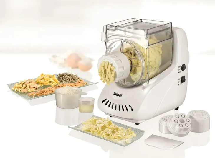 Domowy makaron bez pracochłonnego, ręcznego wyrabiania ciasta. Tak, teraz to możliwe. Automat do wyrobu makaronu Unold to nowoczesne rozwiązanie dla miłośników włoskiej kuchni. Samoczynnie wymiesza i ugniecie ciasto, a dzięki ośmiu dołączonym do zestawu tarczom możesz wybierać między różnymi kształtami makaronu. Zalety to m. in. zbiornik na 500 g ciasta do makaronu, automatyczne miksowanie i ugniatanie ciasta oraz pokrywa z zabezpieczeniem wyjmowana w celu ułatwienia mycia. W zestawie 8 elementów - do makaronu: pappardelle, linguine, fettuccine, spaghetti, tagliatelle, rigatoni, tarcza do ciasteczek i lej do napełniania kiełbas.
