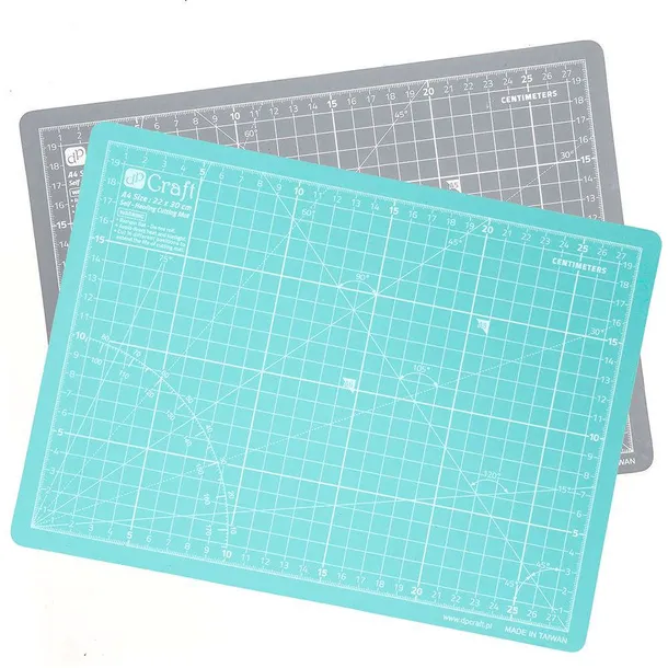 Mata do cięcia samoregenerująca. Pięć warstw chroni zarówno twoje biurko, jak i nożyk. Na obu stronach nadrukowana jest siatka centymetrowa i linie kątowe. Posiada milimetrową miarkę na każdym boku. Dwustronna miętowo-szara.