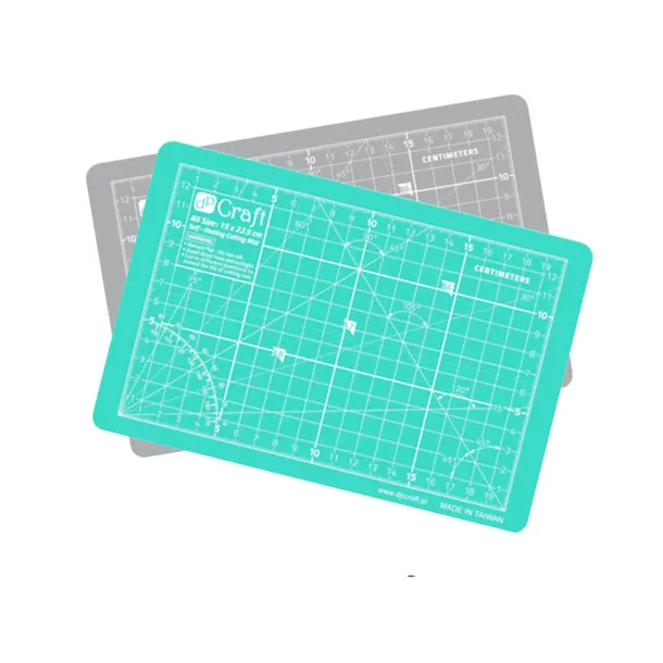 Mata jest dwustronna. Z jednej strony w kolorze miętowym, a z drugiej w szarym. Składa się z pięciu warstw. Na obu stronach maty znajduje się siatka i miara w centymetrach, co ułatwia dokładne i precyzyjne cięcie.