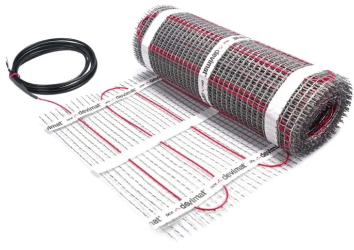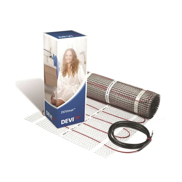 jednostronnie zasilana, samoprzylepna mata grzejna o grubości 3,5mm przeznaczona do instalacji elektrycznego ogrzewania podłogowego w pomieszczeniach suchych oraz wilgotnych ze szczególnym uwzględnieniem podłóg cienkowarstwowych. Maty DEVImat™ wykonane są w formie gotowych do układania zestawów grzejnych posiadających fabryczną mufę i kabel zasilający o długości 4mb. Wykonane są zgodnie z normą IEC60335-2-96. Spodnia strona maty grzejnej pokryta jest wolnoschnącą warstwą kleju umożliwiającą szybki montaż na każdym rodzaju podłoża.