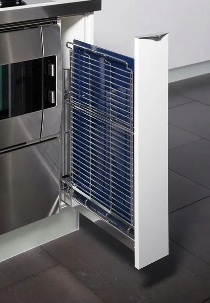Wyciąg wąski na blachy lub stolnice Style "15-tka" do szafek dolnych. Dedykowany jest do bardzo wąskich szafek kuchennych i małych przestrzeni użytkowych. Mocowany do frontu szafki, doskonale sprawdza się jako podręczny schowek do przechowywania blaszek na ciasta lub stolnicy kuchennej.