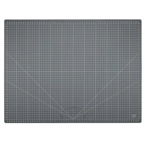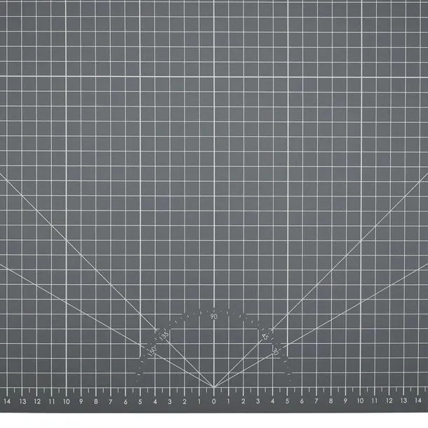 Powierzchnia jest nadrukowana po obu stronach: biała strona zawiera siatkę z podziałką w centymetrach oraz oznaczenia standardowych formatów kartek, natomiast strona antracytowa ma siatkę wychodzącą od środka i zaznaczone kąty. Antypoślizgowa faktura stabilizuje matę i materiał podczas pracy, co ułatwia cięcie nożykiem, skalpelem czy nożem krążkowym nawet przy większych arkuszach.