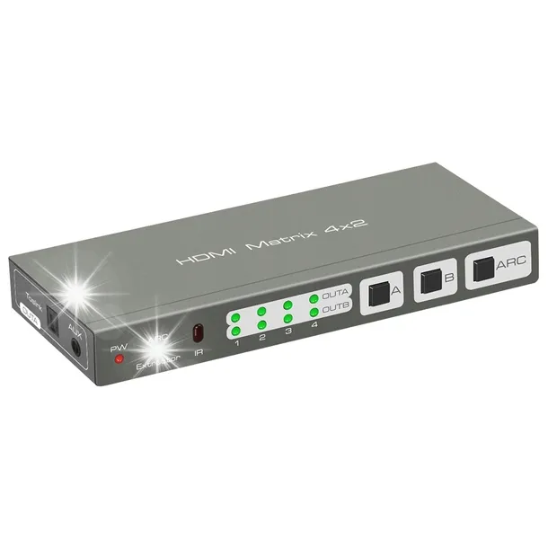 Matrix HDMI pozwala na podłączenie do 4 urządzeń HDMI i dzielenie ich bezstratnie na dwa wyjścia HDMI. Dodatkowo każdy z ekranów może wyświetlać różne obrazy, w zależności od wyboru. Dzięki wzmocnieniu sygnału, urządzenie przesyła obraz bezstratnie nawet na większe odległości. Maksymalna rozdzielczość przesyłanego obrazu to 4Kx2K @ 60Hz. Urządzenie obsługuje także kanał HDMI ARC i ekstrakcję dźwięku.