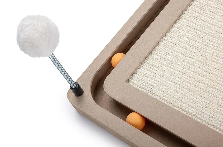 Centralnie umieszczona powierzchnia z sizalu umożliwia bezpieczne i skuteczne ścieranie pazurów, pomagając w utrzymaniu ich w dobrej kondycji i chroniąc meble przed zniszczeniem. W otaczającym sizal torze znajdują się ruchome piłeczki, które kot może toczyć łapką, co stymuluje zmysły i zapewnia rozrywkę. Na sprężynującym pałąku umieszczono kolejną piłeczkę, która dodatkowo zachęca do interakcji i polowania.
