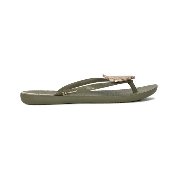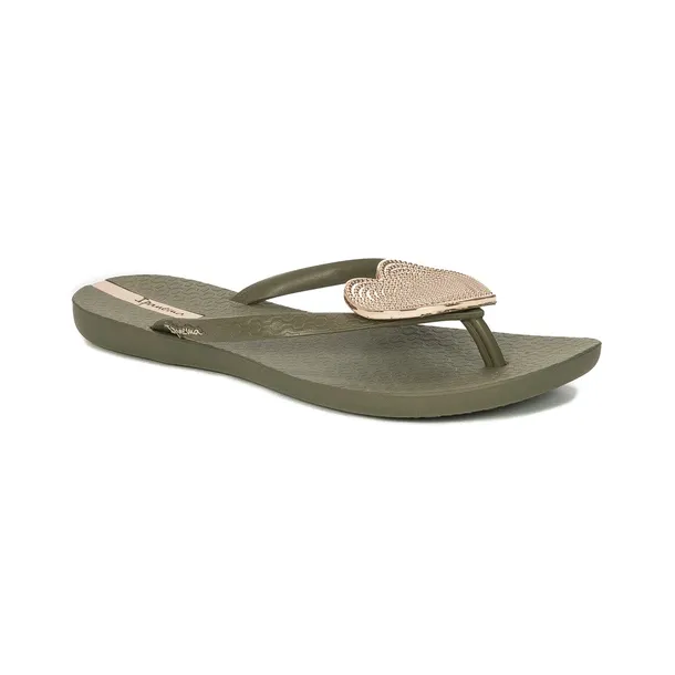 Ipanema to marka, której kolekcje są zgodne z najnowszymi trendami i inspirowane stylem ulicy największych europejskich miast. Propozycja tej marki to oryginalne i przykuwające wzrok klapki damskie japonki gumowe wykonane w całości z wysokogatunkowego tworzywa w kolorze zielonym z beżową wstawką. Na przodzie piękna błyszcząca ozdoba w formie złotego serca. Dobrze wyprofilowana, wygodna wkładka o wysokości 1,5 cm daje duże poczucie komfortu. Antypoślizgowa podeszwa daje poczucie bezpieczeństwa zarówno na suchej jak i na mokrej powierzchni. Łatwe do umycia i zabrania ze sobą w podróż, ponieważ zajmują bardzo mało miejsca. Idealnie sprawdzą się na plaży i na basenie, ale nie tylko. To klapki, które powinnaś mieć.