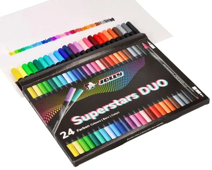 Każdy mazak jest dwustronny co daje jeden kolor, ale z cieńszą lub grubszą końcówką w zależności od rodzaju wykończenia jaki chcemy osiągnąć. Do bardziej precyzyjnych sprawdzi się cienka końcówka, do zakreśleń lub pokolorowania większej części sprawdzi się grubsza.