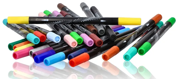 Każdy mazak jest dwustronny co daje nam jeden kolor, ale z cieńszą lub grubszą końcówką w zależności od rodzaju wykończenia jaki chcemy osiągnąć. Do bardziej precyzyjnych sprawdzi się cienka końcówka, do zakreśleń lub pokolorowania większej części sprawdzi się grubsza.