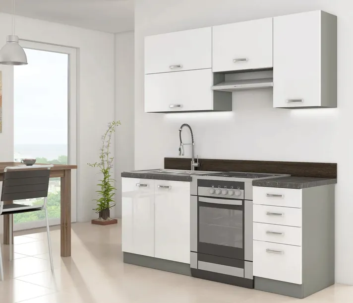 Korpusy mebli wykonane są z wysokogatunkowej płyty laminowanej, co gwarantuje trwałość i łatwość w utrzymaniu czystości. Kolor korpusów, delikatny odcień szarego, doskonale komponuje się z frontami w połysku, tworząc harmonijną całość. W zestawie znajdują się różnorodne szafki dolne i górne, umożliwiające optymalne zagospodarowanie przestrzeni kuchennej. Szafki dolne posiadają pojemne szuflady z systemem cichego domyku, co sprawia, że korzystanie z kuchni jest niezwykle komfortowe.
