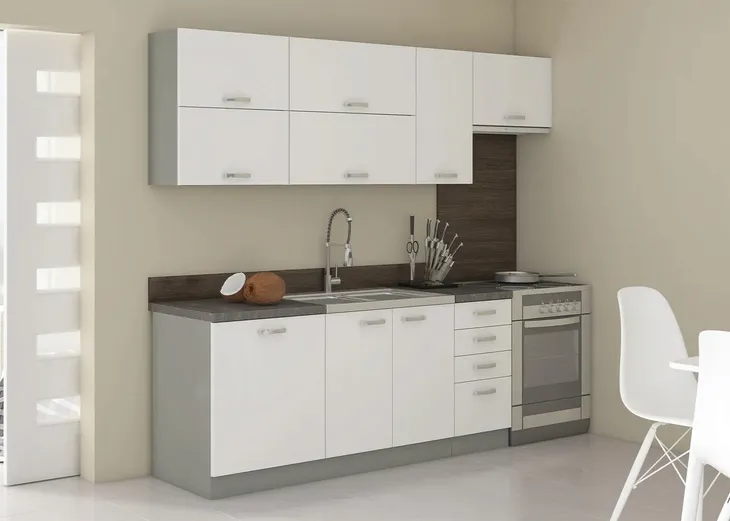 Zestaw składa się z modułowych szafek kuchennych, co daje nieograniczone możliwości aranżacyjne. Dzięki tej elastyczności, możesz dostosować układ mebli do własnych potrzeb i preferencji. Zarówno górne, jak i dolne szafki posiadają solidne uchwyty ze stali nierdzewnej, które nie tylko ułatwiają otwieranie, ale także dodają meblom nowoczesnego wyrazu.