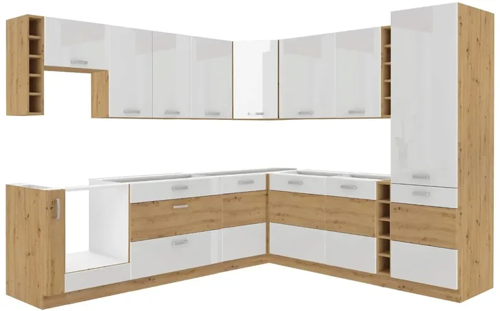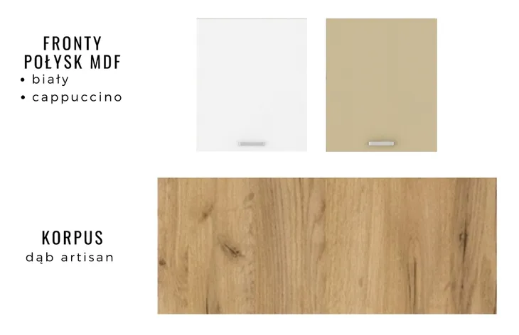 Front: płyta laminowana 16 mm dąb artisan / płyta MDF połysk 16 mm / obrzeże ABS
