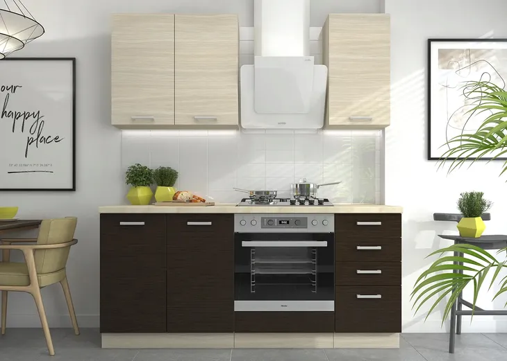 Fronty mebli Ordox zostały wykonane z solidnej płyty laminowanej o grubości 16mm, co gwarantuje trwałość i łatwość utrzymania w czystości. Front górny prezentuje się efektownie w odcieniu Dąb Ferrara, podczas gdy dolny w Legno Ciemne, dodając kontrastu i głębi całej kuchni. Obrzeża melaminowe oraz ergonomiczne uchwyty o rozmiarze 160mm z tworzywa sprawiają, że meble nie tylko pięknie wyglądają, ale są też wygodne w użytkowaniu.