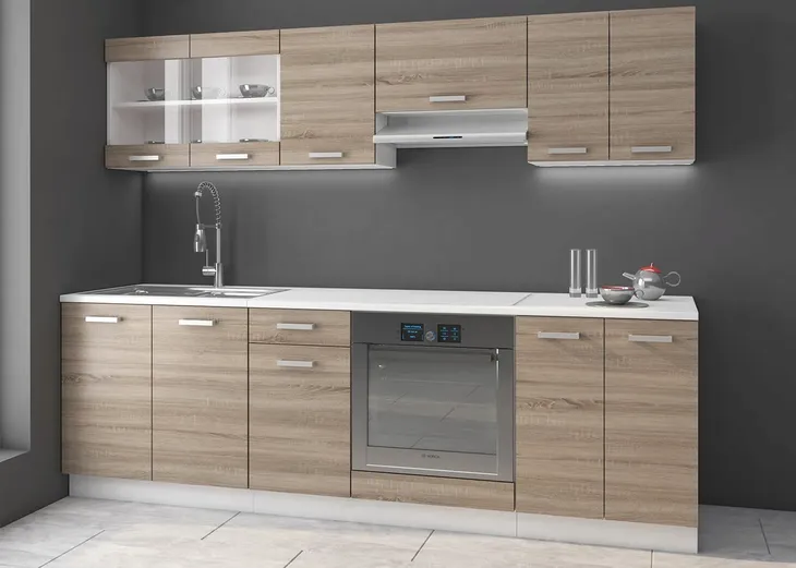 Mebel kuchenny Vella to połączenie elegancji, funkcjonalności i trwałości. Fronty z dębu sonoma trufel nadają ciepła, a biały korpus dodaje przestronności. Szafki oferują inteligentne rozwiązania organizacyjne, a solidne wykonanie gwarantuje długą żywotność. Z uchwytami plastikowymi i metalowymi zawiasami, Vella to inwestycja w komfortowe gotowanie i stylową kuchnię. Odkryj nowy wymiar kulinarnego doświadczenia z meblami Vella!