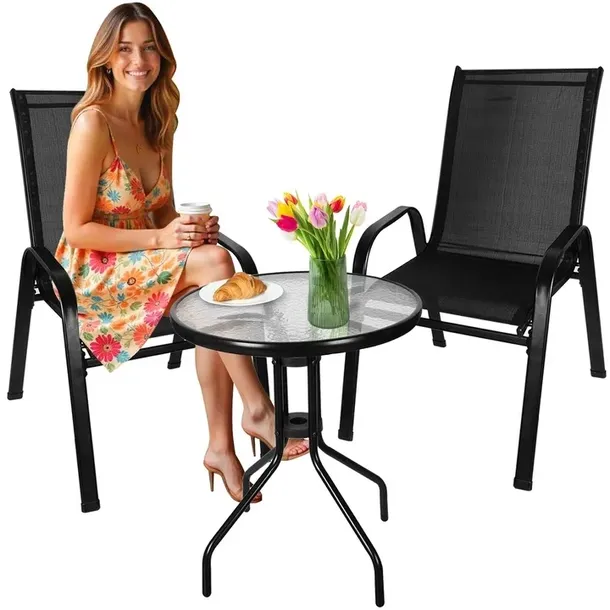 Zestaw składa się z wygodnych krzeseł z wysokimi oparciami do wsparcia kręgosłupa oraz stylowego stolika ze szklanym hartowanym blatem o grubości 5 mm. Meble są łatwe w utrzymaniu czystości i można je wykorzystać zarówno na zewnątrz, jak i wewnątrz pomieszczeń.