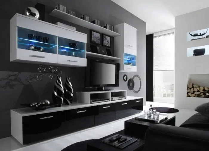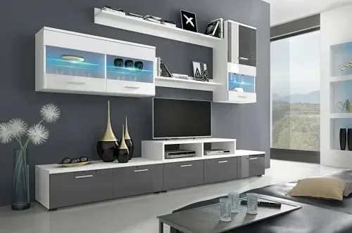 Meblościanka BETA idealnie komponuje się z nowoczesnymi wnętrzami. Fronty wykonane na wysoki połysk. Meblościanka została wykonana z płyty laminowanej.